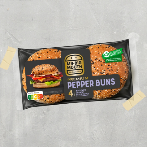 De Mr. BigMouth Pepper Bun geeft je burger pit. Een zacht premium broodje met een subtiele peperkick en crunchy sesame-corn topping. Ready-to-eat en nóg beter na een korte toast.